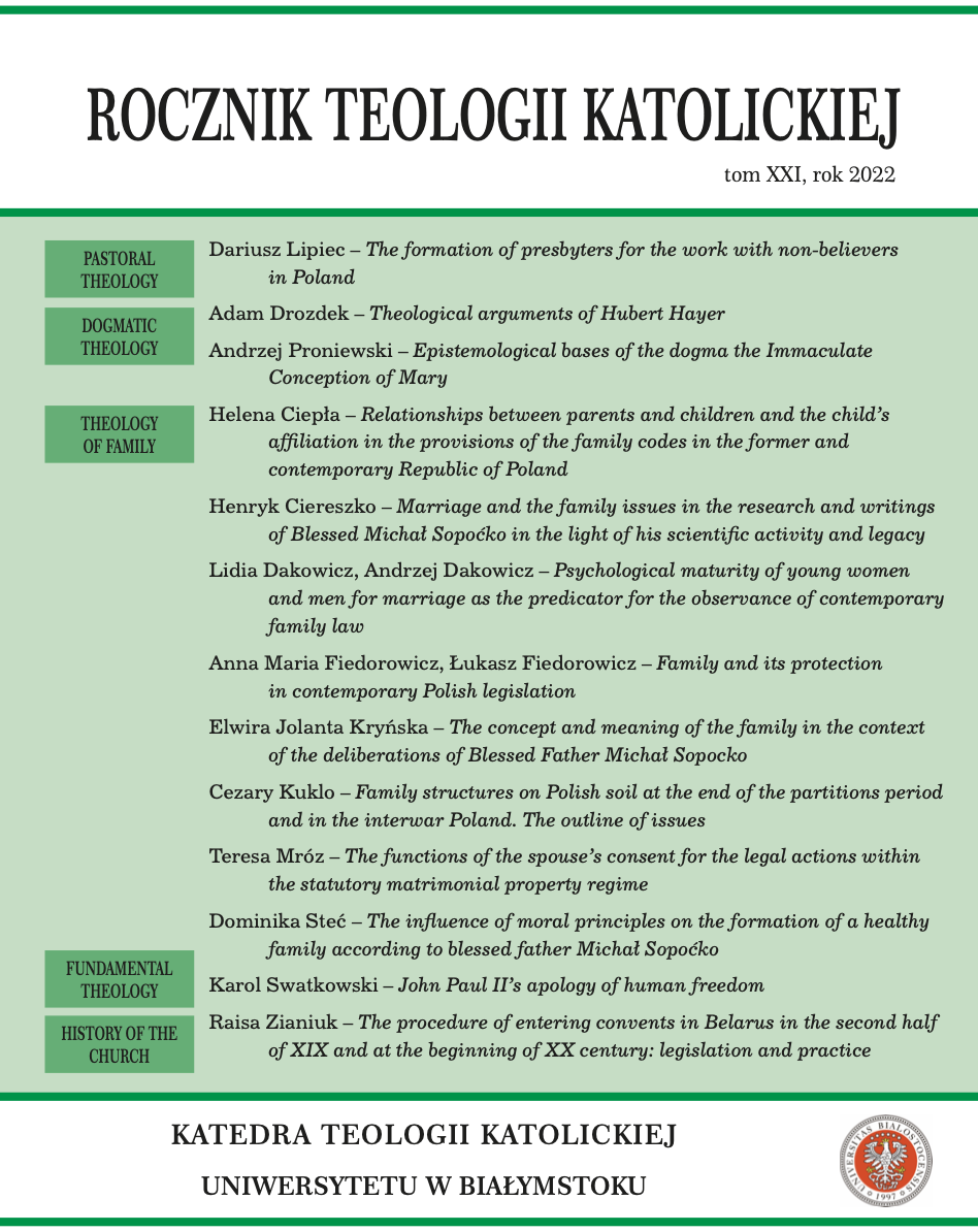 The Annual of the Catholic Theology (In Polish: Rocznik Teologii Katolickiej) is an academic journal disseminating the results of the research in the field of theology as well as coming out from the dialogue with other sciences on a meta-theological level. It is published annually. This journal contains articles from various areas of theology. It seeks to disseminate the latest studies and projects of both, the scholars of the field and of those, whocooperate with the Chair of the Catholic Theology. The research andscholarly work are reflected in articles that combine ethical, social, and religious issues in their inter-cultural conditions. The journal serves the purpose of sharing the results of cooperation with scholarly communities in Poland and abroad. The texts are published only in English. The journal is available both in print and in digital form.